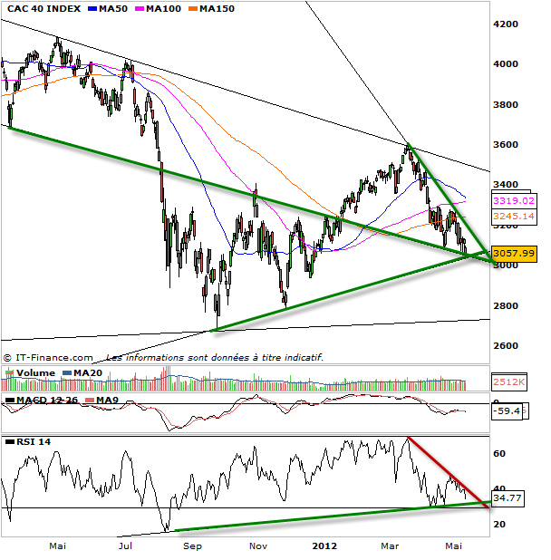 Le CAC 40 a eu beau rompre le support des trois dernières séances 3078 après un gap baissier ce matin, le sell-off ne s’est pas produit soutenu par le biseau descendant et donc cette fois-ci le support oblique se trouvait sur les 3037 points. On arrive donc dans uen zone de support oblique haussier (figure en triangle symétrique mis en relief dans l’analyse de ce weekend) et au contact du support oblique d’un biseau descendant. Voilà de quoi donner une réaction acheteuse ou alors cela validera pour de bon un sell-off sur rupture baissière du biseau descendant et là je ne pense pas que les 2940-2096 seront à même de juguler la puissance vendeuse. En attendant les acheteurs ont donc encore un espoir avec ce double support mais en clôturant sous 3098 et surtout sous 3078 la tendance est bien fragile.