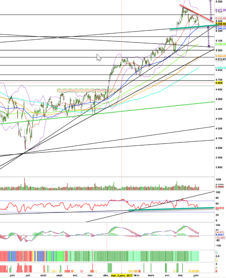 En attendant, les vendeurs gardent la main et nous voilà prêt à une bataille importante ces prochaines séances sur la zone 5240-5250 points.