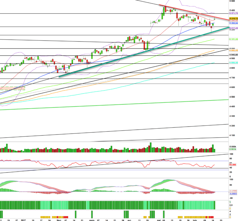On est donc enfermé entre deux obliques qui créent une figure de congestion. La cassure à la hausse ou à la baisse confirmera donc l’avènement d’une nouvele tendance à privilégier. Entre les deux bornes cela reste neutre. Même si en repassant les 5280-5295 points, les acheteurs ont repris l’ascendant. Le plus dur maintenant, sera de confirmer.