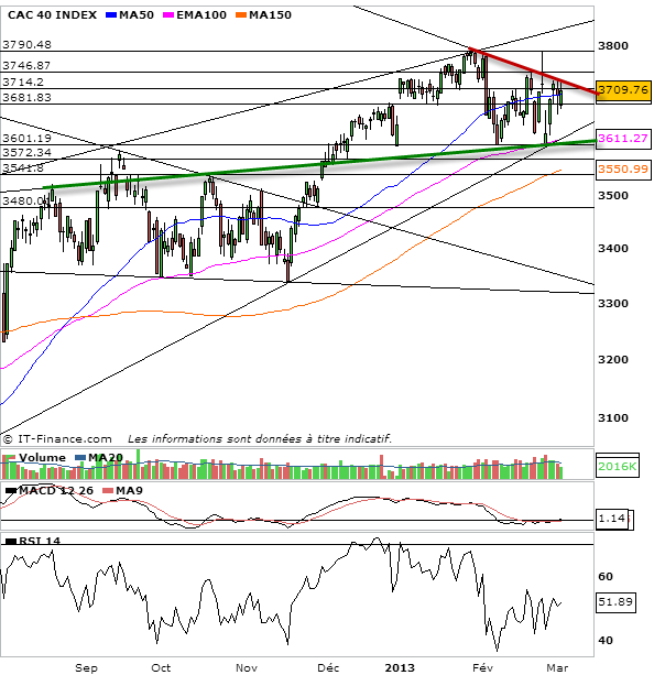 Rien de bien neuf. Encore une séance du cac 40 qui se fait dans la zone et encore un échec des acheteurs à dépasser l’oblique résistance. Cela continue donc de tenir mais qu’est ce que c’est fragile. ou c’est moi qui me fait des idées ? Il est vrai que le marché a de quoi nous faire douter. J’ai d’ailleurs douté aujourd’hui tellement, que j’ai refait du trading et non conservé en swing. Pourtant j’ai la conviction que ce marché s’épuise. Mais le temps que cela met me fait douter et je préfère jouer la prudence en restant court terme au risque de louper le top départ. Le timing reste extrêmement difficile.