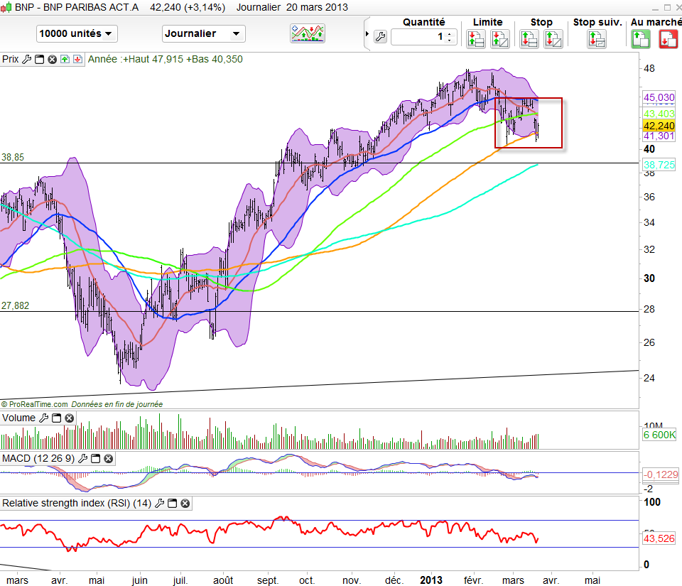 J’avais pu déjà en parler mais pour moi pour savoir où ira le cac40 et le futur de la tendance de la bourse, il faudra suivre fortement les actions des banques. C’est d’elles que viendra la suite sur la tendance du cac40. Ainsi même si le cac40 tient encore bien le coup, lorsqu’on analyse les trois actions bancaires du cac40 on se rend compte que le mal est déjà fait et qu’avec de tels gaps baissiers, le retournement correctif, baissier est déjà en place. Je vois donc mal comment le cac40 pourrait résister encore très longtemps et ne par repartir à la baisse pour rompre les 3760 et aller chercher les 3680-3710 points. Il est certain que cela se fera en zig zag et avec volatilité ce marché redevient risqué, et non ouvert au buy & hold. il va falloir à nouveau savoir faire tourner rapidement les positions.
