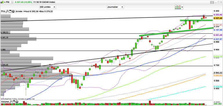 Niveau CAC 40 je mets deux pivots. un sur 6060-6160 points, pivot moyen terme de tendance. et l’autre plus court terme sur 6280 et 6220. Au-dessus c’est haussier point barre avec une réserve donc de sentiment de marché. Sous 6280 on commence à souffler, sous 6220 à parler de consolidation. Mais on ne dégrade pas plus que ça tant qu’on tiendra 6060-6160 points.
