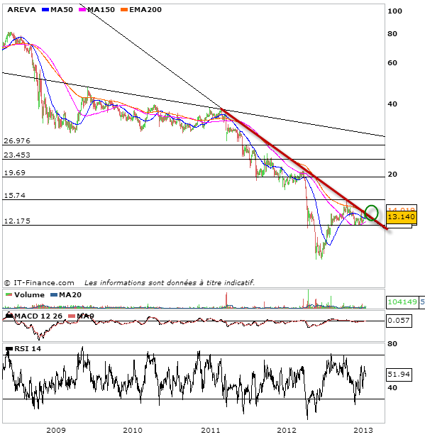 ce n’est pas la première fois que je vais parler de l’action Areva sur graphseo bourse puisque voilà déjà quelques semaines que je suis l’action qui de plus en plus s’intègre à ma stratégie. Comme vous le savez l’action Areva a connu une tendance baissière forte, renforcée par les évènement en mars de 2011 de Fukushima et le fait que le solaire semble de plus en avoir un avenir contrairement au nucléaire. Oui mais voilà, le graphique de l’action Areva semble lui nous raconter une histoire tout autre. Après avoir lancer un rebond technique à partir des 10€ voilà que l’action consolide depuis de longs mois sous son oblique baissière long terme. Ce n’est que pure anticipation à ce stade, mais l’action Areva semble bien se préparer à une rupture haussière de cette oblique, et par là même à la fin de sa tendance baissière installée depuis 2007.