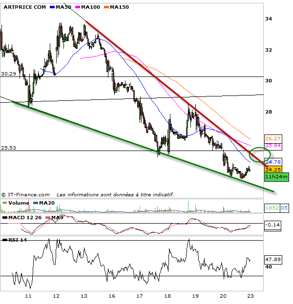 Comme je suis du genre têtu, je m’intéresse à nouveau à Artprice qui cette fois devrait lancer un rebond technique plus important que les 12% que l’on pouvait acquérir la dernière fois. Le niveau de prix actuel semble de plus un niveau intéressant pour des investisseurs long terme au sein d’un PEA mais également pour des traders bien que le volume d’échange ne soit pas énorme non plus. Niveau graphique on se retrouve dans un biseau descendant qui devrait donc sur cassure haussière délivrer un rebond technique haussier plus important et durable que le dernier. Je vais notamment passer acheteur sur débordement des 25,50 euros. Je conserverai dès lors les titres dans mon PEa pour un investissement à moins d’un rebond qui soit violent. Je vise 39,40 euros.