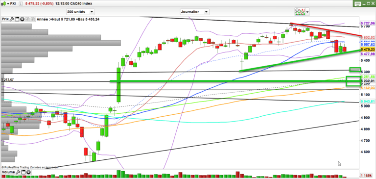 Niveau CAC 40, on poursuit la dégradation et il convient de rester prudent après un rebond technique hier qui échoue sur résistance, on test la zone de support dorénavant. Si ça lâche, on peut accélérer en direction des 5400 points et si le marché veut trouver prétexte à vendre les résultats et ne plus trouver de catalyseurs haussiers, alors la zone des 5200-5300 peut faire un appel du pied. Mais je pense comme depuis quelques semaines, que cette zone sera vue comme une opportunité. Je me méfie entre temps juste de la volatilité qui peut advenir du à un effet peur de perdre. Là aussi on saura vendre sans discernement.