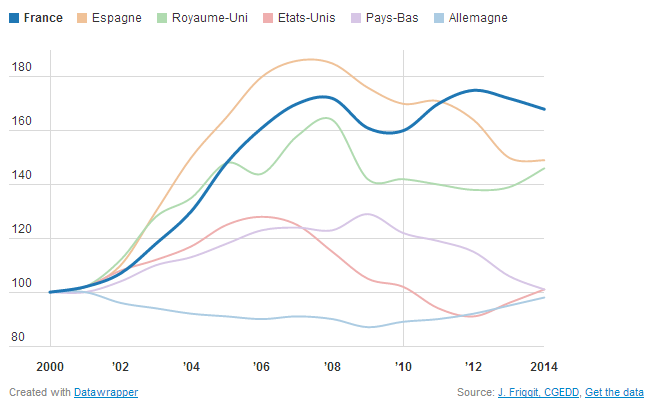 Une nouvelle étude de Frigitt sur les prix immobiliers en France démontre la bulle en cours et la crise qui arrive. Personne ne sera surpris de cette énième étude négative sur le devenir des prix immobiliers en France. De nombreux analystes, experts et spécialistes de l’immobilier pensent maintenant que les prix immobiliers en France ne peuvent que baisser. Certains pensent qu’il y aura une baisse forte et rapide sous forme de crash d’ici à 2015, d’autres pensent que la baisse se fera lentement sur 5 à 7 ans. Quoiqu’on en dise, si le marché immobilier continue de stagner proche des plus hauts aujourd’hui en France il se retrouve néanmoins en grand déficit d’acheteurs. Sans acheteurs il n’y a pas de transactions, sans transactions, pas de ventes et encore moins de besoin de construction pour de nouveaux logements. La baisse de l’immobilier serait à percevoir comme une crise énorme car la majorité du patrimoine de tous les Français y est investi et malheureusement la majorité de ces Français se sont fait abuser en se faisant éduquer depuis des décennies que l’immobilier n’était pas un placement spéculatif mais un investissement sûr. Beaucoup risquent de déchanter et cela n’arrive pas qu’aux autres, il suffit pour cela de s’intéresser à l’Espagne. Le secteur de l’immobilier emploi aujourd’hui énormément de personnes. Une baisse des prix immobiliers et la croissance zéro actuelle de la France deviendrait une bonne nouvelle.