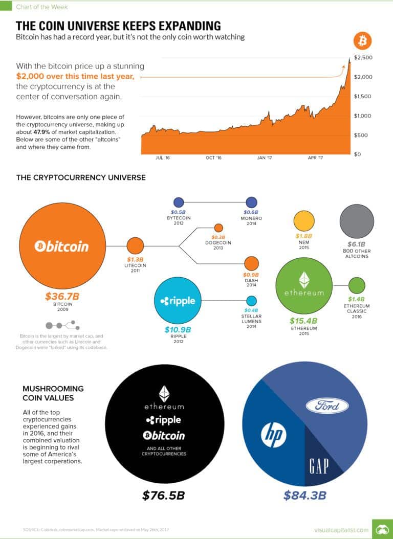 Mis à part le bitcoin, il existe trois autres crypto devises notables: Le litecoin, crée en 2011, très similaire au bitcoin mais plus rapide dans les confirmations de transaction. l’Ethereum, né en 2015 dispose déjà d’une capitalisation de 15 milliards de dollars.Puis enfin le Ripple, déjà utilisé par UBS, RBC ou  encore Bank of America et Santander.