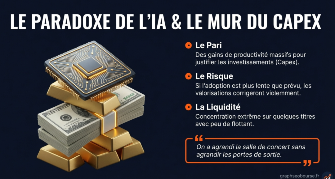 L’IA est devenue le moteur exclusif de la cote, créant une concentration de marché délirante. L’analogie est brutale : nous avons agrandi la salle de concert (les valorisations de Nvidia ou Microsoft) sans jamais agrandir les portes de secours (la liquidité).