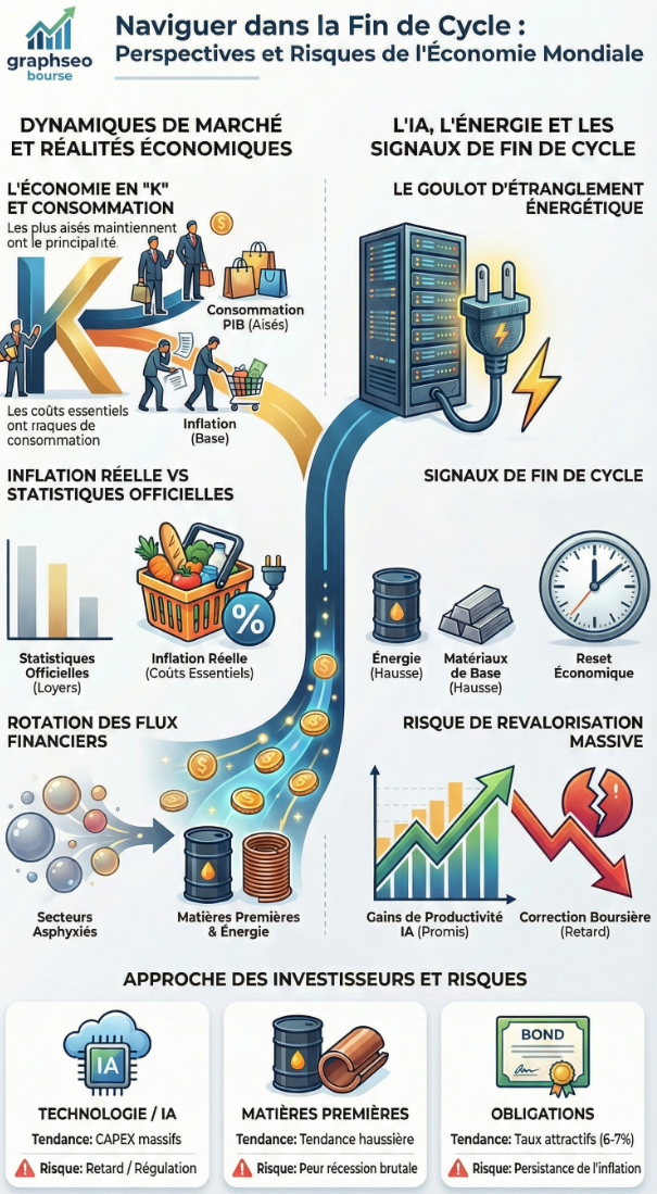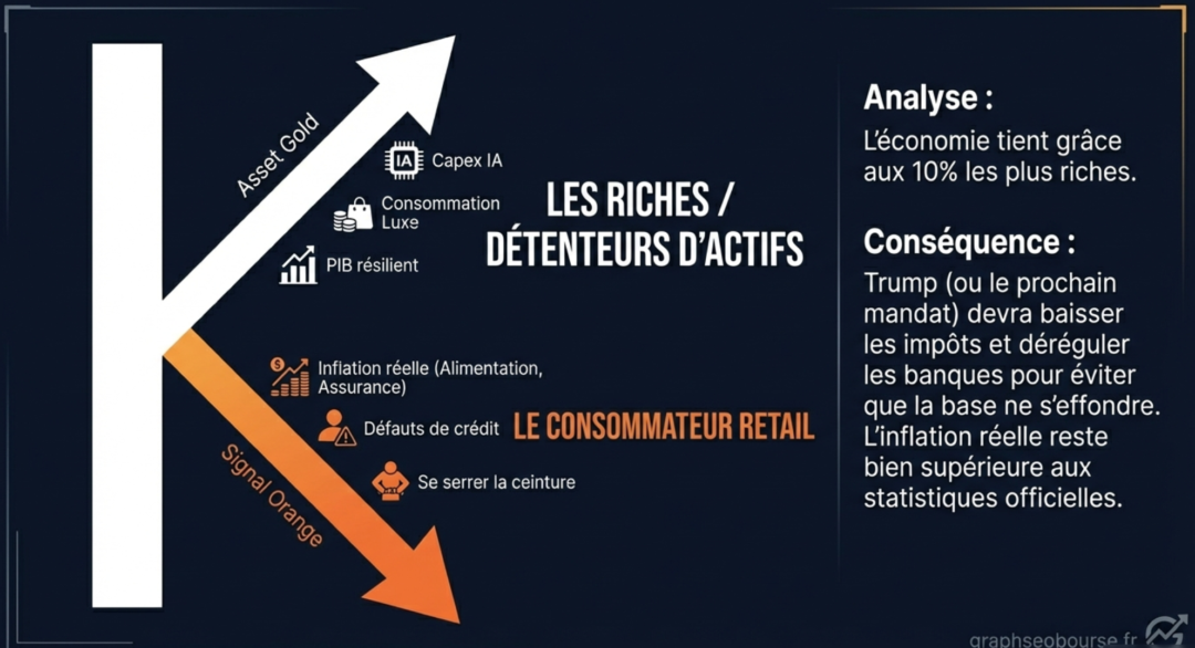 D’un côté, les plus aisés continuent de consommer massivement, portant le PIB à bout de bras. De l’autre, la base — le consommateur gagnant moins de 100 000 $ — se serre la ceinture et commence à faire défaut sur ses dettes. Le marché finira par ignorer les stats lissées pour se confronter à l’inflation « réelle » des coûts incompressibles qui asphyxie la majorité.