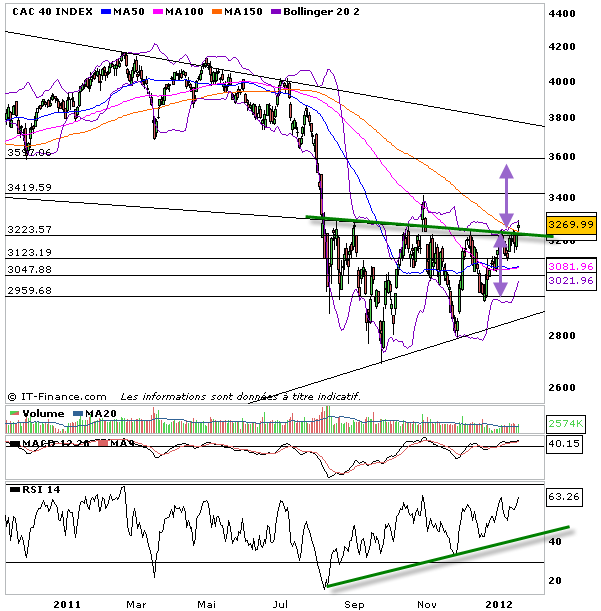 La rupture à la hausse des 3210 a donc validé la rupture haussière des 3230 avec une clôture au-dessus de ce niveau et donc aujourd’hui l’attaque du premier objectif haussier des 3290 points avec un reflux opéré prouvant la présence déjà de vendeurs. On demeure donc à l’achat sur le cac 40 au-dessus des 3223 points, soit l’oblique baissière rompue à la hausse aujourd’hui qui nous permet de valider un nouveau potentiel haussier sur cassure effective des 3290 avec pour objectif final les 3590-3600 points et avec pour résistance intermédiaire 3375-3430 points.