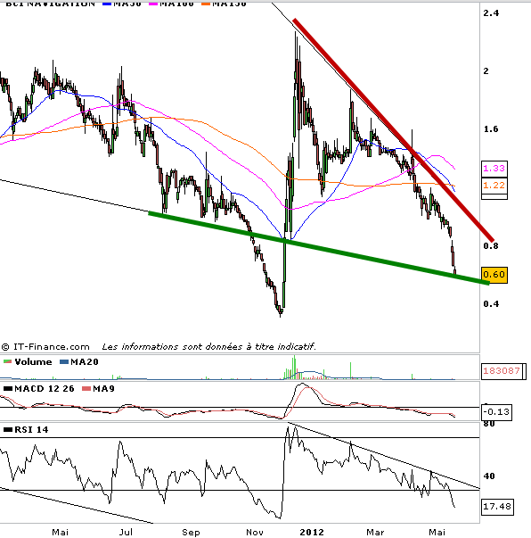 L’action BCI navigation fait partie de ces coups spéculatif qui deviennent intéressant à acheter juste pour quelques séances. En effet on vient de venir se poser sur le support oblique baissier d’un biseau descendant. Ce qui offre une opportunité d’acheter pour jouer un rebond technique.