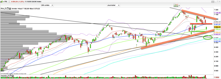Car pour revenir à ce que j’expliquais dans la vidéo de ce weekend, il ne faut pas sous estimer l’usure. Ainsi, on revient à nouveau sur un support des 6750 qui semble fonctionne. Si jamais ça craque il reste la zone des 6666-6680 points. Un support oblique mais qui commence à être testé de plus en plus en moins en moins de temps. Alors tiendra t-il encore une fois mais il faut se méfier car trop le tester peut signifier aussi sa fragilisation. Auquel cas, en dessous, le marché ouvrirait la voie au test des 6600-6550. n’oublions pas qu’au dessus de ce niveau, la tendance de fond reste haussière; L’enjeu actuel est de ne pas jouer aux devinettes dans une environnement volatil où bcp de flux sont absents.