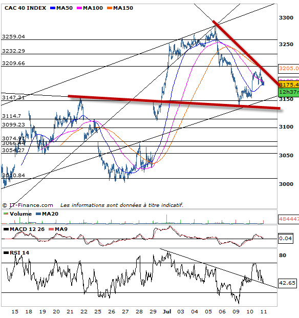 Le rebond sur le cac 40 a eu lieu aujourd’hui, il fût rapide et tout autant éphémère même si la clôture n’est pas trop dégueulasse, elle n’en reste pas moins pas très encourageante pour la suite, laissant donc le soin à la seule FED de sauver la tendance haussière. Si avant ce rebond la tendance comme j’avais pu en parler était incertaine elle le devient d’autant plus ce soir, avec ce rebond sans volumes, et surtout avorté à 3 points de la résistance des 3209 points. cela témoigne de la fragilité des acheteurs, dans une tendance attentiste. Si la tendance moyen terme demeure haussière au-dessus des 3130 points, on se place avec la séance de ce soir en incertitude totale.