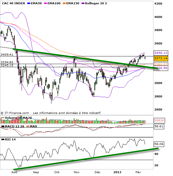 En ouvrant directement par un gap baissier vendredi matin et en demeurant sous les 3409 points, le cac 40 valide un nouvel épisode de consolidation dans une tendance qui demeure haussière à terme tant que le trend sur le rsi perdure. Ce mouvement de consolidation qui viserait à faire souffler les marchés ne devrait pas en remettre en cause la tendance de fond haussière majeure et ce tant que nous sommes au-dessus des 3245 points.