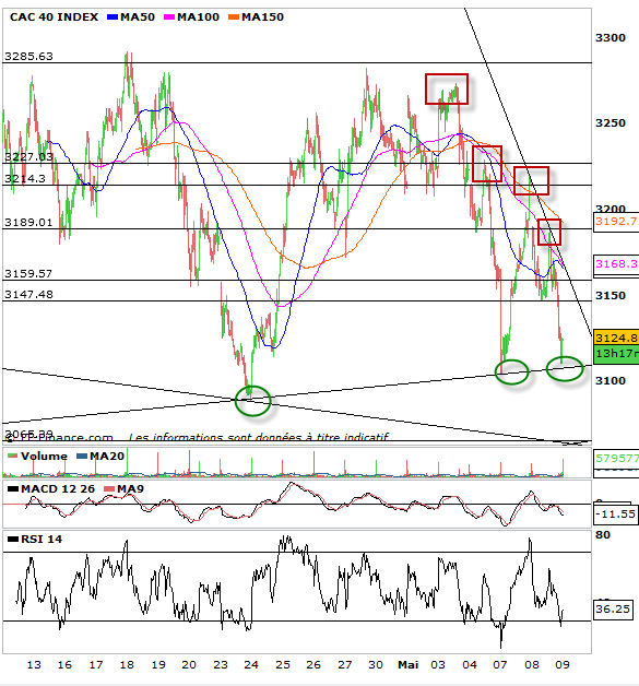 En ce jour férié, le CAC 40 n’a pas chômé pour effacer le gain enregistré la veille ce qui prouve que nous n’avions affaire qu’a un rebond technique, fort certes mais rebond technique qui avait retracé 61 % de la baisse depuis les 3285 points chose parfaitement anticipée par Ju, fab et K2r. La séance du jour est fortement intéressante par le fait que le cac 40 a testé tous les niveaux clés précédemment cités. Ainsi les 3148 ont permis de lancer une attaque sur 3190 qui a repoussé les cours pour rompre 3148 et lancer l’attaque des plus bas d’hier avec cependant une réaction acheteuse pré clôture sur 3111 points. Si la tendance demeure baissière à court terme sous un niveau qui était à 3227, passé à 3211 puis que je passe ce soir à 3190 points, il n’en reste pas moins que ce qu’il faut observer c’est que nous enregistrons depuis quelques jours des plus hauts de moins en moins hauts et des plus bas de moins en moins bas, ce qui indique que nous sommes dans une tendance certes baissière sous 3190 mais qui demeure une tendance de congestion. C’est à dire que le marché n’est un marché que pour les day traders avec des yoyos. Par contre la congestion devient de plus en plus forte avec des supports qui furent sur 3088 puis 3104 et maintenant sur 3111 et des résistances sur 3285 puis 3218 et maintenant 3190/ Les bornes deviennent de plus en plus rapprochés. Je conseille donc de rester fortement observateur et d’attendre une sortie qui dégagera une nouvelle tendance forte que l’on pourra suivre en swing trading.