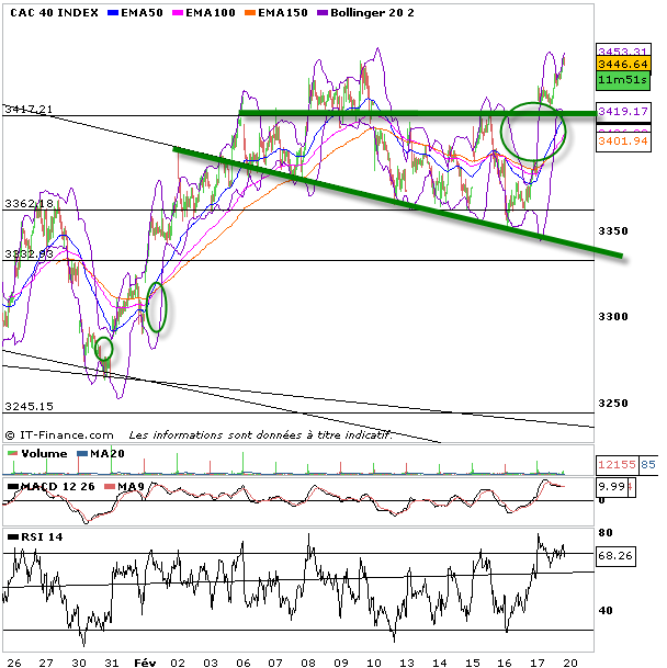 Opinion positive cac 40 au-dessus des 3417 points avec encore au forceps le potentiel de rallier 3470-3500 points.