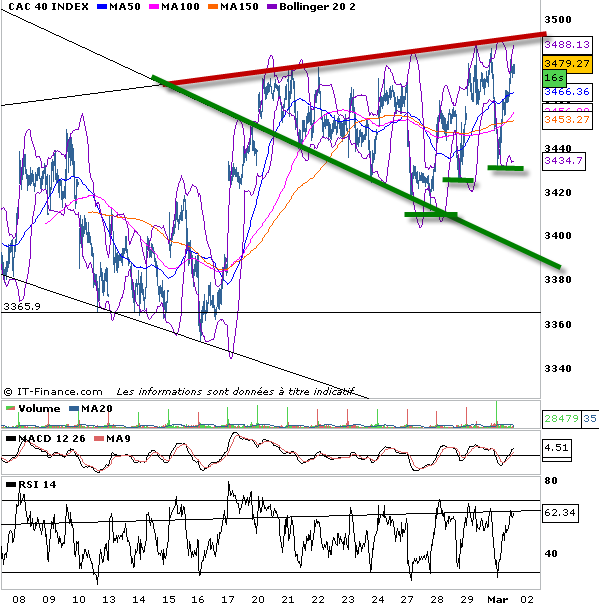 Avec des US rouges hier soir, le salut vient tout de même d’une activité industrielle bonne en Europe. Finalement on se dit que le risque de double dip n’existe plus et que l’économie semble auto entretenir sa croissance. Et voilà une nouvelle fois que les acheteurs profitent d’un dip pour relancer les achats. Au final les plus bas sont toujours de plus en plus haut, c’est chaotique mais la tendance demeure acheteuse. On reste dans une figure de no man’s land, incertaine.