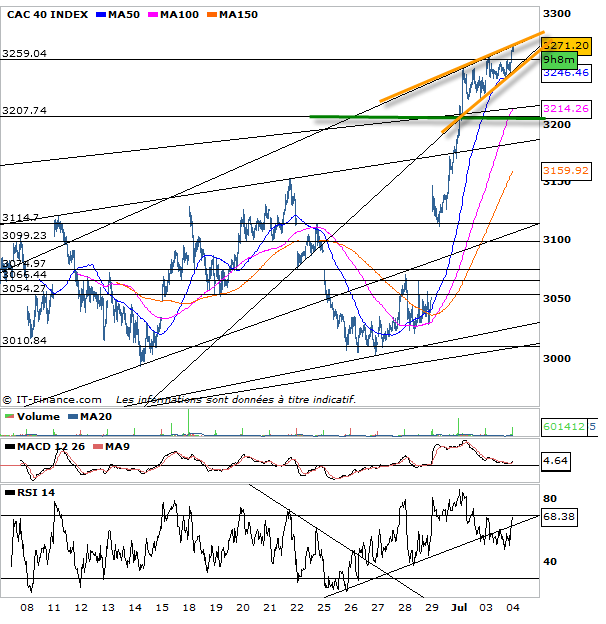 La tendance du cac 40 est résolument haussière. on évolue dans un biseau ascendant, et après près de 8 % de hausse, le cac fait au pire de la consolidation à plat. La hausse se poursuit, avec certes moins de puissance de feu des acheteurs mais tout de même, rien n’indique donc la vente. Au mieux on pourrait se dire qu’une consolidation serait bénéfique. c’est vrai une consolidation ne remettrait pas en question cette tendance haussière et pourrait être une opportunité pour les retardataires de prendre le wagon de la hausse en chemin. Mais attention à tout esbrouffe concernant ce rallye, un piège à éviter.