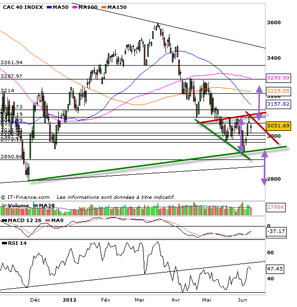 Les US ont clôturé pas mal ce vendredi et ce weekend on pourrait bien avoir un sauvetage des banques espagnoles. de quoi nous offrir un gap à l’ouverture lundi. La séance de vendredi a cependant fait naître une faiblesse dans le courant acheteur. Sauf excellente nouvelle ce weekend, je pense donc que la consolidation a toutes les chances de se poursuivre. A moyen terme la hausse n’est à ce moment q’une rebond technique et je crois que les investisseurs devront rester sur leurs gardes tant que les 3130 points ne seront pas franchis. A plus court terme ce rebond ce fait selon un trend haussier très pentu, c’est ce trend qui a permis de soutenir le marché vendredi et d’éviter une baisse plus prononcée. par contre les acheteurs furent incapables de refranchir les 3065, là se trouve le signe de faiblesse.