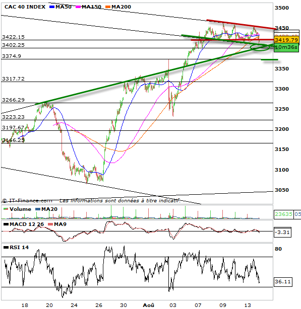 Le temps de rentrer et voilà déjà le cac 40 qui enfonce un peu sa tendance du jour malgré des volumes assez faibles. Comme je voulais le démontrer le cac 40 patinait en consolidation à plat depuis la fin de semaine dernière. La zone des 3422 points jouant le rôle de support. A la rupture baissière de ce niveau le cac devrait aller chercher les 3400 points. Support de la tendance haussière actuelle. Si le CAC 40 sous 3422 valide une consolidation et donc une prudence pour les acheteurs, ce n’est que sous 3400 points qu’un mouvement correctif de la hausse s’enclencherait avec comme objectif les 3370 puis 3310 points.