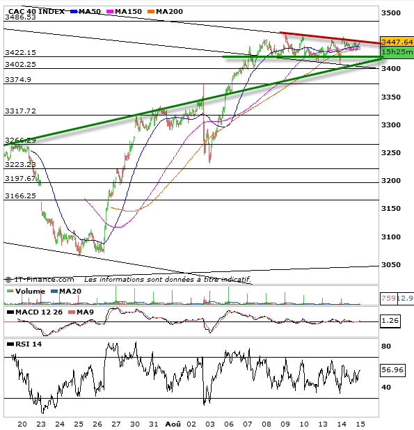 Nouvelle séance de consolidation à plat pour le cac 40 avec un 5ème doji de suite et des volumes de plus en plus anémiques. Cette consolidation aujourd’hui avec une réaction avec gap haussier et un maintient au-dessus des 3430 points semble annoncer une rupture par le haut de l’oblique baissière et donc une poursuite du mouvement haussier vers les 3490 points. En repassant au-dessus des 3422 points le cac 40 donne maintenant plus de probabilités de repartir à l’assaut des 3460 pour aller chercher les 3490 points dans un ultime effort. Les volumes sont pour autant faibles et il convient de rester prudent. Les niveaux cités dans l’analyse d’hier restent les mêmes.
