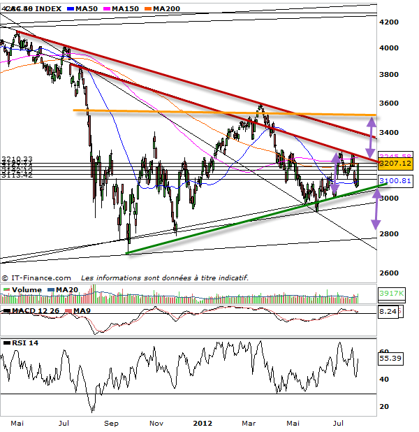 Quelle séance impressionnante du CAC 40. Voilà je ne sais plus quand je disais me méfier de jouer la vente à découvert la semaine dernière car j’étais craintif de la moindre annonce inattendue. Comme toujours les annonces font monter le CAC 40 mais toujours rien n’est fait, alors parler suffira t-il à lancer une tendance haussière de long terme ? On en est encore loin, mais cette séance vient d’annuler la mauvaise configuration qui se mettait en place. Du même coup heureusement que j’étais devant le marché ce matin, pour apprécier la bonne tenue du support oblique qui ma poussé à rentrer sur des valeurs comme Axa, Archos et Soitec. Moi qui avait fini par douter hier…
