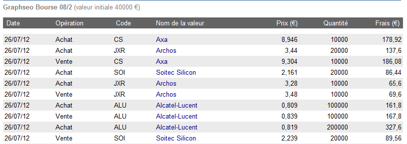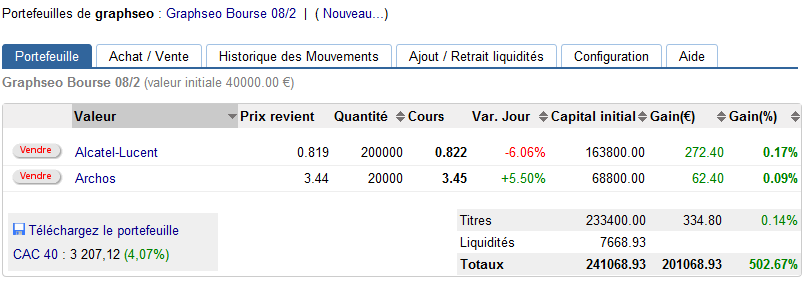 Le CAC 40 avait réussi hier a me faire douter et lâcher mes positions, certes elles n’étaient plus à moindre risque mais j’étais convaincu d’un rebond technique, pas aussi important que celui du jour. Heureusement ce matin je prends la décision de rentrer à l’achat par anticipation. Alors si ce soir le cac avait plonger, je dirai que cette anticipation était encore une erreur. Mais parfois la chance certains appelleront cela le feeling fait partie du jeu. Bref il est difficile de dire pourquoi je suis rentré. Je pense car le cac tenait le support oblique et surtout que Axa et les valeurs bancaires en général tenaient très très bien et après archos et soitec avaient beaucoup souffert dernièrement et évoluées dans des figures en biseau qui arrivaient à leur terme, les carnets étaient également bien remplis à l’achat réduisant le risque de ne pas pouvoir vendre dans une chute. Les trois valeurs réagissent bien avant la pause déjeuner et puis au retour boom, le cac est à +2% , Archos à +8%.