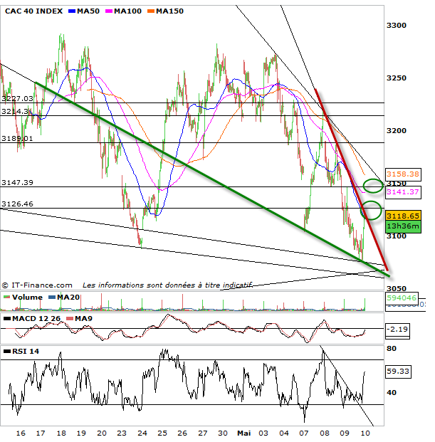La réaction acheteuse de fin de séance sur le cac 40 a bien sauvée la tendance qui semblait bien enfoncer non seulement les 3111 points mais surtout les 3088. pourtant toute cette baisse s’est faire de manière ordonnée, pas de grand secouage de cocotier et surtout en respectant le support oblique d’un biseau qui avec la séance du jour à donner toute sa pertinence, c’est que le marché le suis donc également et qu’il faut s’en servir pour trader. Si on marque un rebond de fin de séance salvateur il n’en reste pas moins qu’avec un plus haut à nouveau plus bas sur 3145 points, la tendance baissière sur le cac 40 reste marquée, il convient donc de rester prudent même si à titre perso j’ai préféré une nouvelle fois être agressif en rentrant d’ores et déjà. Pour un investisseur cependant il convient d’observer surtout le franchissement des 3126 points puis des 3147 pour confirmer. au-dessus de ce niveau et seulement au-dessus de ce niveau on pourra croire en un rebond haussier plus durable.