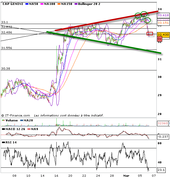 La semaine dernière je regardais de près l’action Cap gemini, en surperformance depuis un moment et dans le cadre d’une consolidation du cac 40, une position et stratégie de vente à découvert me semblait justifiée. On pouvait voir que le titre cap gemini évoluait dans un triangle en porte voix, résistance et support s’écartent avec le temps. J’ai donc décidé par anticipation de rentrer en trois fois sur ce trade en vente à découvert. Deux ordres furent pris lorsque Cap gemini toucha par deux fois le haut de la résistance de la figure. 25 % par position. Puis j’ai pris les 50% autre de position sur confirmation de consolidation soit la cassure des 31.10 euros.