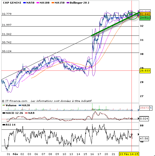 Je viens de prendre une position de vente à découvert sur l’action Cap Gemini. Sur bris des 32,78 euros je double ma position de VAD. Premier objectif un retour sur les 32 euros. Si vraiment les baissiers prennent la main un ptit retour sur les 31,30 euros serait en ligne. Dans tous les cas attention aux mauvaises surprises, stop serré sur 33 euros