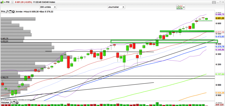 Un début de consolidation très court terme se met en place sur le cac 40. Rien de bien méchant au-dessus des 6630-6610. En dessous la reprise de souffle serait actée certainement vers la zone des 6520 qui reste un premier niveau de soutien avant d’entrevoir une consolidation plus poussée qui resterait saine jusque 6400 points. En, attendant, petite reprise de souffle. on joue tout de même la montée des taux, l’inflation à terme en l’actant avec de la consolidation sur les valeurs techs. Du coup le CAC 40 reste fort avec ses valeurs value/cycliques.
