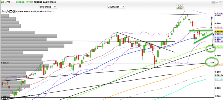 On surveillera cependant le sens de sortie de cette congestion qui nous donnera soit un signal vers une relance vers les plus hauts et de nouveaux records soit une correction un peu plus forte vers la zone des 6300 points.
