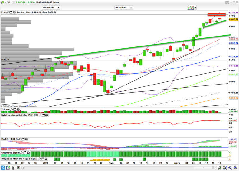 Niveau cac 40 ras au-dessus des 6000 à court terme. c’est haussier, en embuscade pour les 6100 points. On a bien compris le message également au niveau des bancaires.
