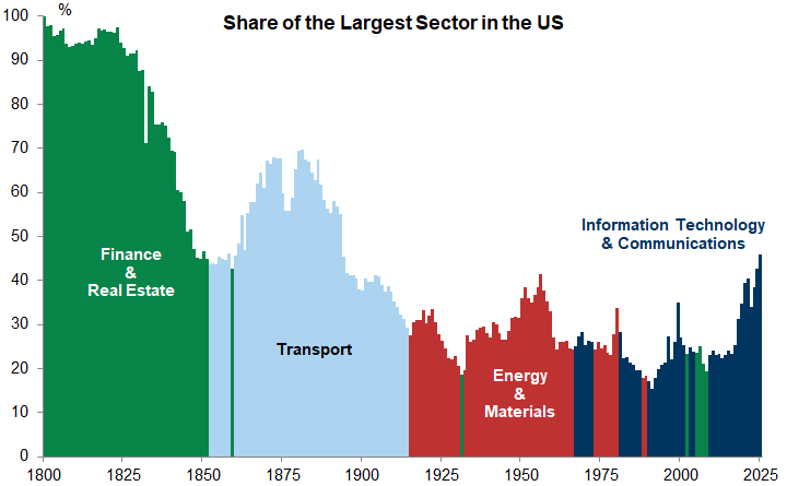 Mais ce n’est pas nouveau. Ce type de concentration a déjà eu lieu par le passé. A l’époque c’était sur des valeurs industrielles. ici le graph s’arrête à 2019, donc on est aujourd’hui sur des niveaux records comme avant la crise de 1929.