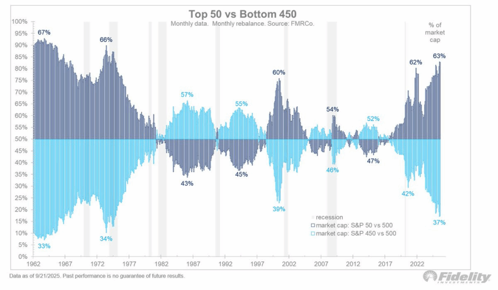 Ici on voit bien le top 50 des grosses caps surperformer le marché et au fur et à mesure que le marché s’y concentre, être le marché.