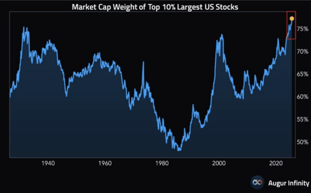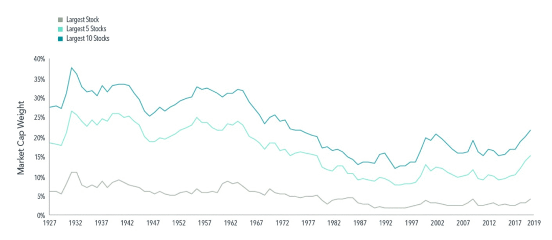 Mais ce n’est pas nouveau. Ce type de concentration a déjà eu lieu par le passé. A l’époque c’était sur des valeurs industrielles. ici le graph s’arrête à 2019, donc on est aujourd’hui sur des niveaux records comme avant la crise de 1929.