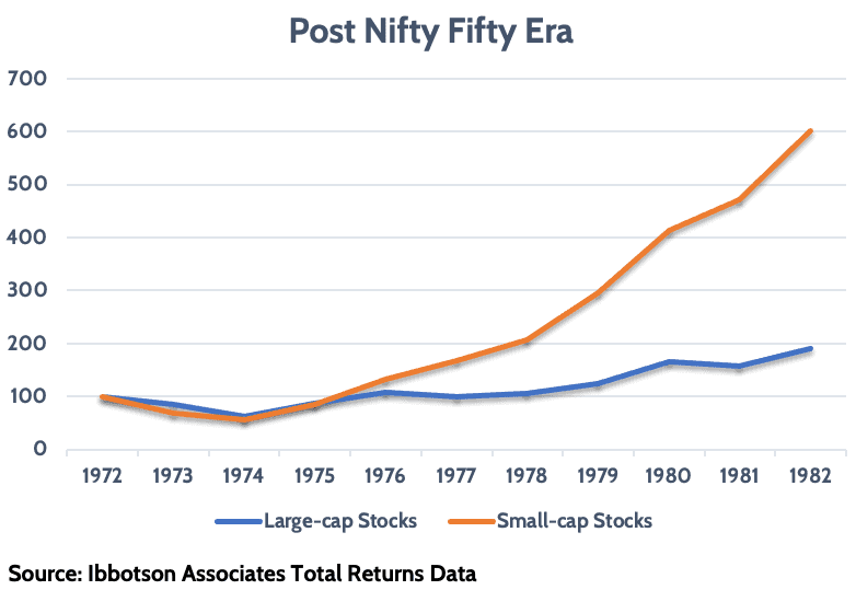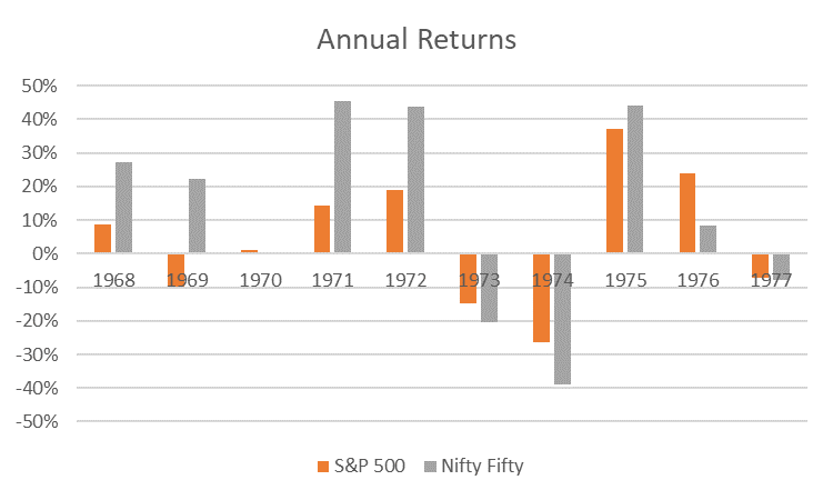 On passe à la partie la plus intéressante. La période des années 60 à 80 dite Nifty fifties. en gros 50 valeurs comme aujourd’hui qui représentent l’ensemble du marché. Si tu les a pas, tu sous performe et on te rigole au nez. S’il y’avait eu des ETF à l’époque, on aurait eu 90% des gérants avec des résultats plus mauvais que l’indice.