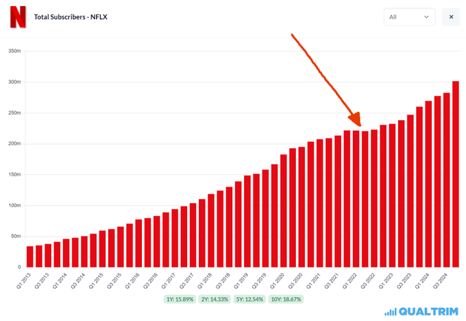 N’oublions pas qu’il n’a fallu qu’une décélération dans le nombre d’abonnés de Netflix pour faire baisser la valeur de 70%