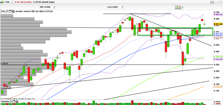 En attendant, sur le CAC 40 c’est haussier point barre. Deux niveaux pivots pour moi pour stopper le bouquet final. Repasser sous 6580 et 6520 points. Tant qu’on est au-dessus on reste positif. En dessous la partie de zig zg reprendrait.