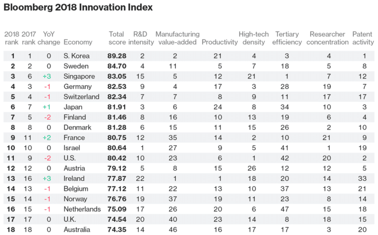 Voici le classement par Bloomberg des Pays les plus innovants