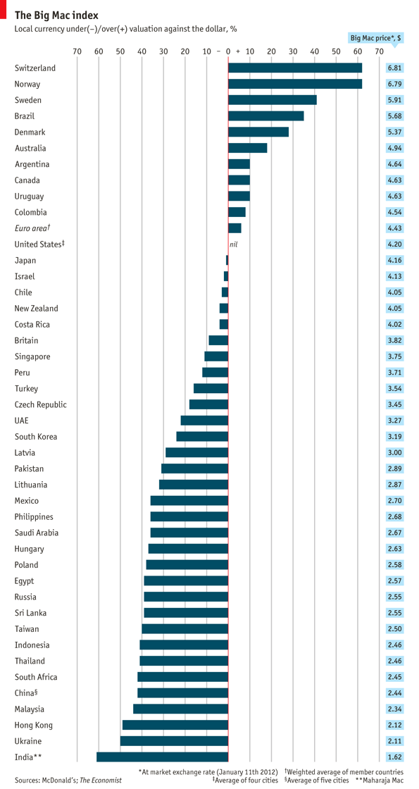 The economist vient de mettre à jour son fameux big mac index qui vise à comparer la force des différentes monnaies dans le monde en comparant le prix d’un big mac dans chacun des pays en fonction de la valorisation des monnaies par rapport au dollar. Intéressant.