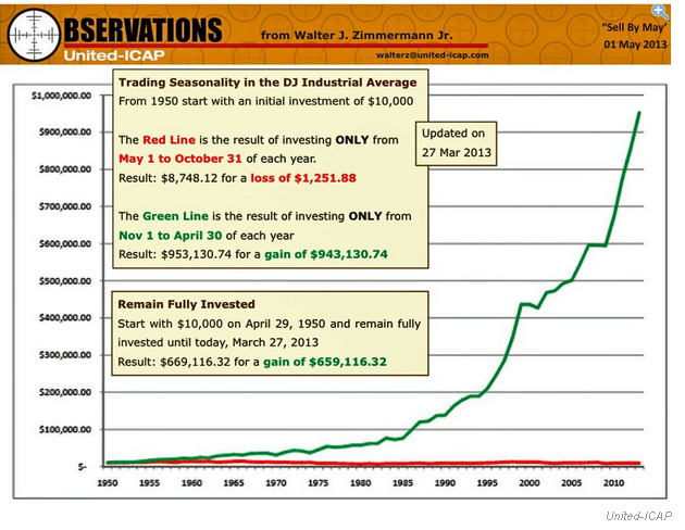 Comme on est en mai et que les marchés ne cessent de monter, c’est encore le tour d’un petit graphique sell in may and go away comme on peut en voir fleurir à chaque printemps. Du coup le petit graphique ci-dessous vous propose de gagner facilement en bourse en n’étant que peu actif. Puisqu’il s’agit de n’acheter qu’une fois en novembre et de vendre en Avril. Puis entre Mai et Octobre d’être en cash et de poursuivre une activité normale. Le backtesting sur quelques décennies selon le graphique, prouve que cela marche…