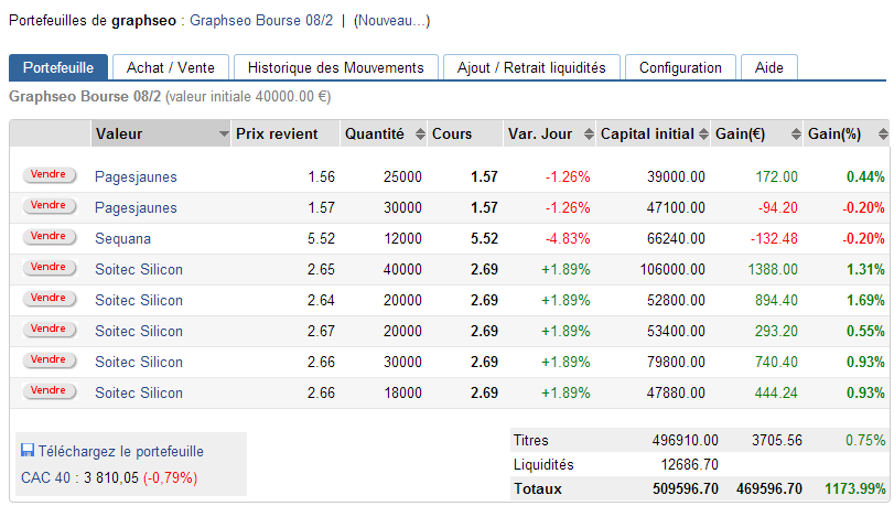 Le timing de l’achat des actions archos permet ce jour de dépasser les 500 000 euros de capital sur la watch list avec un capital de départ de 40 000 euros en février 2008. On approche maintenant des 1200 % de performance globale en 5 ans. Ceux qui suivent graphseo bourse depuis ce temps là auront sans aucun doute accompagné le changement. En effet ce n’est que sur 2012-2013 que la performance s’est réellement envolée et surtout maintenue grâce à l’application de la stratégie de moindre risque. J’ai donc procédé ce jour à un arbitrage. Puisque j’ai pris mes profits sur l’action archos sur les 2,64 et 2,65e en profitant du fort volume et de la hausse pour aller sur une action à la configuration sensiblement identique à court terme: Soitec silicon. J’ai pris pas mal de lignes sur la journée, en plusieurs fois, profitant là aussi d’un carnet d’ordres s’étoffant.(Attention j’ai fait l’essentiel du volumet du jour). J’ai également acquis à nouveau des actions pages jaunes avec un retour sur le bas de la figure en biseau descendant à court terme et j’ai acquis des actions Sequana par anticipation, il est vrai.