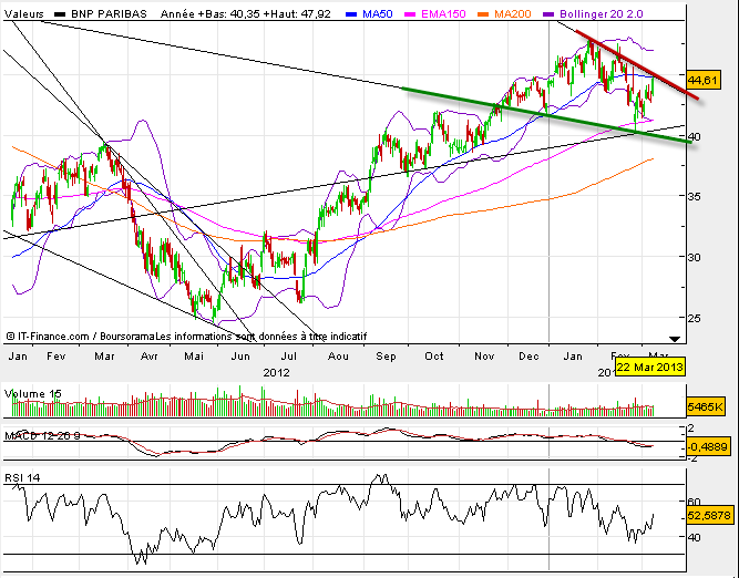 On devrait être vite fixé, car le rebond des bancaires en cette fin de semaine permet de venir tester les obliques hautes, ou tout du moins de s’en approcher. Ainsi, si ces obliques bloquent encore une fois l’avancée des cours des valeurs bancaires cela sera un signal pour moi d’une consolidation engagée, et donc d’un impact sur le cac40 prochainement.