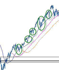 Ci-dessous on peut voir differents types de retracements, plus ou moins profonds. Cela dépends de l’épisode haussier qui a précédé. Le tout est qu’une baisse reste considérée comme un simple retracement tant que les plus bas cours sont de plus en plus hauts, assurant ainsi malgré des retracements, la pérennité d’une tendance haussière.
