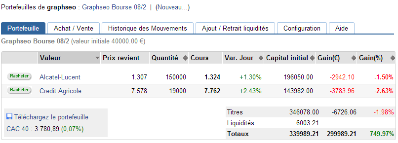 Pour celles et ceux qui se pose la question. La prorogation SRD, c’est lorsqu’on décide de conserver sa position SRD sur le prochain mois. En fait ce qu’il se passe, c’est que votre position est vendue ou rachetée au prix de clôture du vendredi. Vous prenez donc le gain ou la perte. Puis la position est à nouveau achetée ou vendue à découvert au prix de clôture du jour de liquidation. Soit dans mon cas 1,307€ pour Alcatel et 7,578 pour Crédit Agricole. Ainsi ces niveaux de prix, deviennent les niveaux de prise de position et avec les frais cela me donne un nouveau PRU pour les deux positions. Auquel il faut ajouter les frais supplémentaires dus à la prorogation. Au final, je dirai que c’est rarement une bonne idée de proroger, preuve en est. Du fait de la perte enregistrée, je n’ai pu prendre l’ensemble des 20 000 actions Crédit agricole sur la watch list, mais néanmoins sur un portefeuille l’ensemble est prorogé. il faudra juste faire attention, le jour du paiement SRD, car si la position n’a pas évoluée d’une bonne manière, on se retrouve dès lors en insuffisance de couverture.
