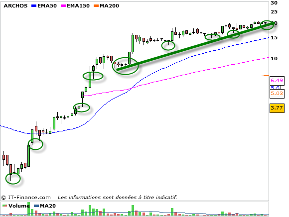 Une tendance haussière en exemple avec en cercle vert les points bas de plus en plus hauts qui confirment la tendance haussière