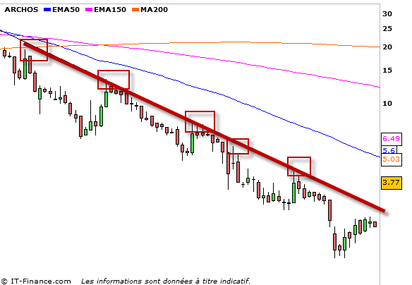 exemple d’une tendance baissière où les points hauts sont de plus en plus bas