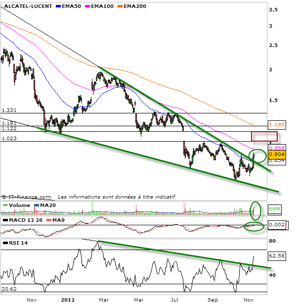 La zone actuelle 0,83-0,93€, symbolisée par un cercle vert, est une zone de consolidation acheteuse. C’est son issue haussière, en rompant les 0,93€ qui permettra une nouvelle poussée vers les 1-1,12 €. Ce n’est qu’en rompant les 1,12€ que l’action Alcatel, validera un signal d’achat long terme et durable. Pour le moment, les investisseurs sur Alu, doivent rester dans un mode recovery, surtout à la vue des incertitudes sur les marchés. On peut utiliser 0,829€ en stop.