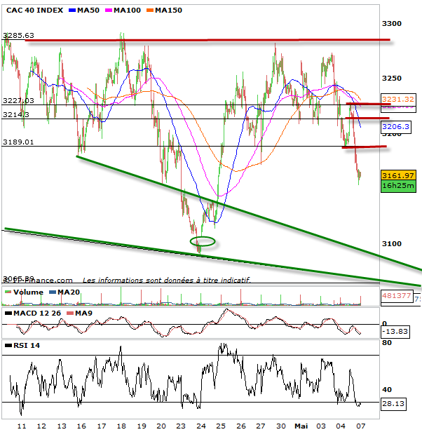 Certains disent que si Sarkozy gagne les élections la bourse lancera un rallye haussier, et que si c’est Hollande on part pour un crash. Au delà de l’effet les premières heures de cotations, où il sera important d’attendre que le feu se consume, je pense que le marché décidera lui même de sa direction. En attendant il envoie un signal plutôt pessimiste et baissier en fin de semaine dernière avec cette incapacité malgré un gap haussier de franchir les 3285 points. Cette incapacité soulignait là la faiblesse des acheteurs, très faciles donc à repousser sous les 3227 points. Sous ces 3227 points le marché passe baissier et les baissiers auront à coeur de viser la fermeture du gap des 3095 points et surtout les 3060 points où converge les droites qui formaient jadis un biseau descendant, qui cassé à la hausse avait permis une poussée haussière bloquée par les 3285 points comme précisé. Je ne pense pas qu’il faille s’attendre à des surprises. il n’y a plus de résultats d’entreprises, on parle toujours zone euro. bref le mois de mai s’annonce devoir être un mois de mai. Pour le moment, je m’abstiens de tout achat sous 3227 points.